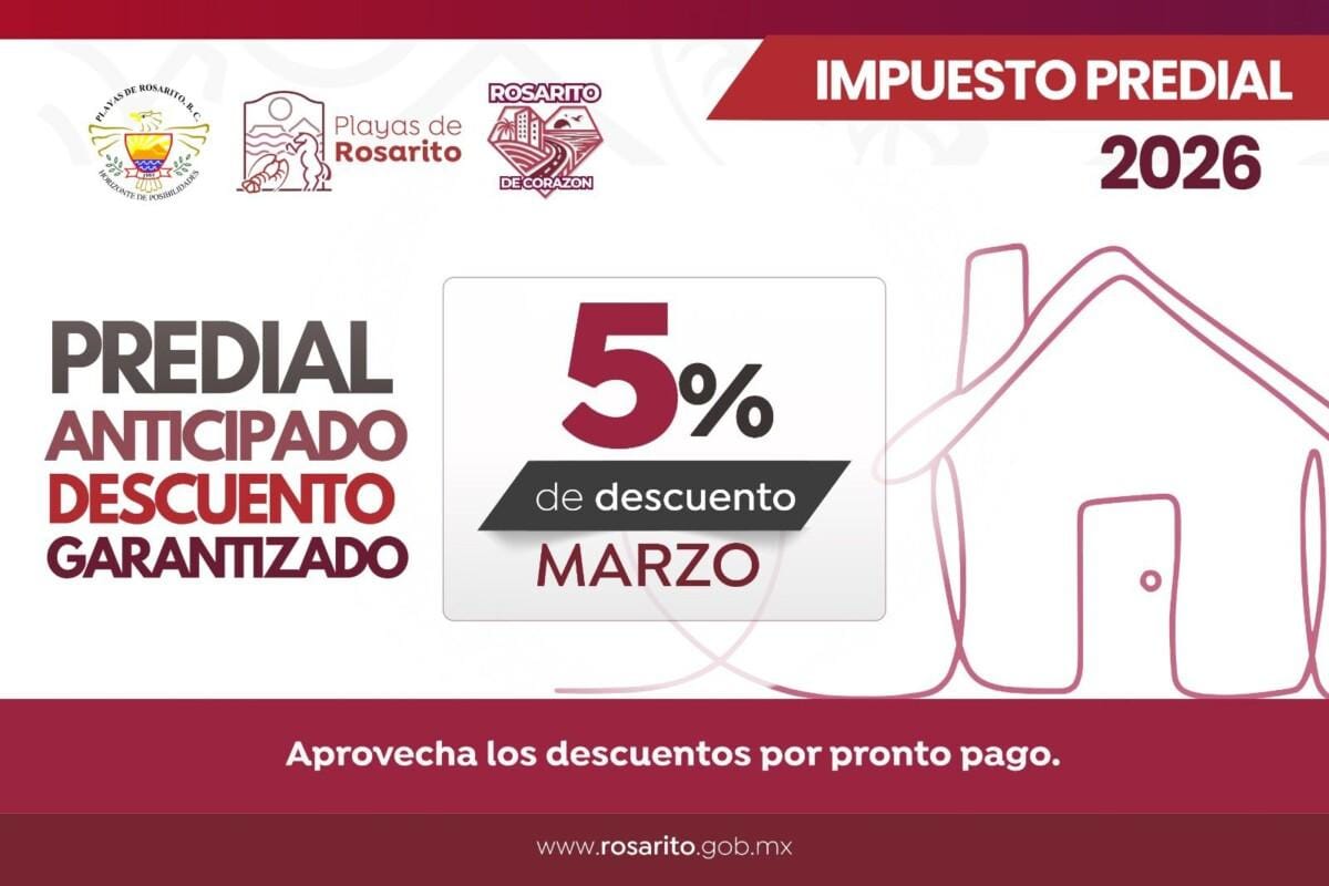 Gobierno de Playas de Rosarito invita a aprovechar el 5% de descuento en el pago del impuesto predial durante marzo
